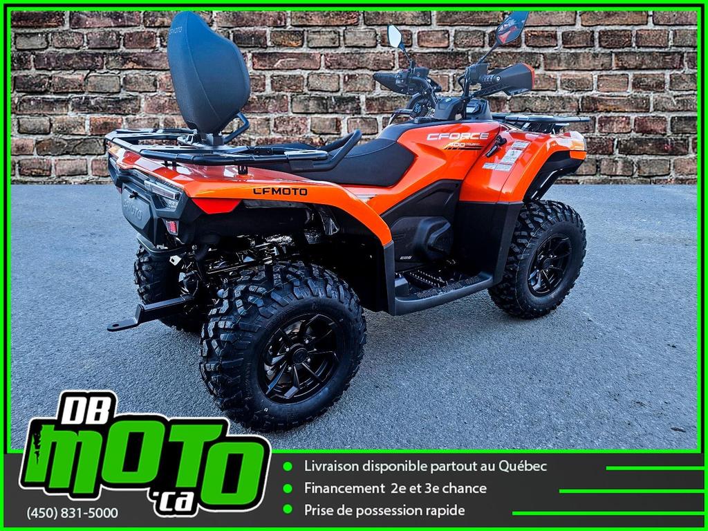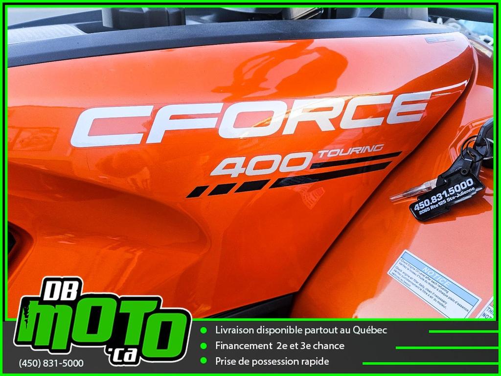 2026 CF MOTO CFORCE 400 2 PLACES TOURING EPS<br><br>Financement facile et rapide disponible à partir de seulement 0%<br><br>- Moteur à injection de carburant de 400 cm3<br>- Système d'embrayage CVTech-IBC<br>- Direction assistée électronique (EPS)<br>- Protège-mains et rétroviseurs latéraux<br>- Tableau de bord à affichage numérique avec instrumentation complète<br>- Prises 12 V et port USB-C à charge rapide<br>- treuil de 2 500 lb<br>- jantes en aluminium de 12 pouces<br>- Plan de protection FACILE disponible.<br><br>Nous reprenons tous vos échanges : côte à côte, vtt, moto, motocross, motomarine, auto, voiture, camion et de tous les marques : bombardier, polaris, cf moto, arctic cat, brp, honda, yamaha, suzuki et plus !<br><br>Vous pouvez retrouver ce véhicule au 2069 route 125 à ste-julienne<br><br>Faites votre demande en ligne en quelques minutes !<br><br>Jusqu'à la 3e chance au crédit. Nous avons des spécialistes en rétablissement de crédit.<br><br>https://www.dbmoto.ca/fr/financement/<br><br>Ou faites votre demande de crédit par téléphone au 450-831-5000 poste 104<br><br>Voyez notre inventaire complète sur notre site web : www.dbmoto.ca<br><br>WE SPEAK ENGLISH TOO !<br><br>LE 0% EST SUR APPROBATION DE CRÉDIT SUR 12 MOIS \*\*