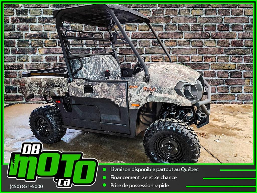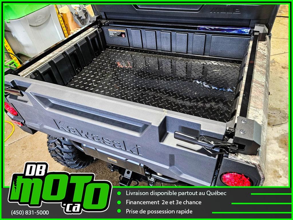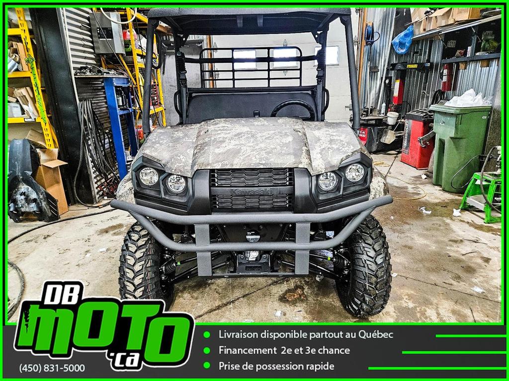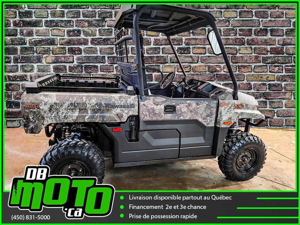 2025 KAWASAKI MULE PRO MX CAMO<br><br>Financement facile et rapide disponible<br><br>- Direction assistée électrique asservie à la vitesse (EPS)<br>- Plateforme de chargement en acier durable<br>- Transmission à variation continue (CVT)<br>- 2WD/4WD sélectionnable électriquement, différentiel arrière à double mode<br>- Phares halogènes et LED<br>- Freins à disque aux quatre roues et frein de stationnement indépendant<br>- Toit ouvrant et carrosserie camouflage True Timber Strata<br><br>Nous reprenons tous vos échanges : côte à côte, vtt, moto, motocross, motomarine, auto, voiture, camion et de tous les marques : bombardier, polaris, cf moto, arctic cat, brp, honda, yamaha, suzuki et plus !<br><br>Vous pouvez retrouver ce véhicule au 2069 route 125 à ste-julienne<br><br>Faites votre demande en ligne en quelques minutes !<br><br>Jusqu'à la 3e chance au crédit. Nous avons des spécialistes en rétablissement de crédit.<br><br>https://www.dbmoto.ca/fr/financement/<br><br>Ou faites votre demande de crédit par téléphone au 450-831-5000 poste 104<br><br>Voyez notre inventaire complète sur notre site web : www.dbmoto.ca<br><br>WE SPEAK ENGLISH TOO !