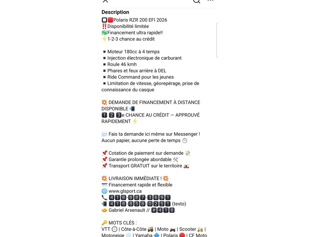 Polaris RZR 200 EFI 2026 Disponibilité limitée Financement ultra rapide!! 1-2-3 chance au crédit - Moteur 180cc à 4 temps - Injection électronique de carburant - Roule 46 kmh - Phares et feux arrière à DEL - Ride Command pour les jeunes - Limitation de vitesse, géorepérage, prise de connaissance du casque - Livraison Gratuite, Rapide et Courtoise Partout dans la Grande Région de Québec !!! 1ère - 2e - 3e chance au crédit, chez GL Sport, faut que sa ce règle !! ** Financement Disponible Sur Place, Par Téléphone et Directement Sur Notre Site Internet ** Garantie Prolongée disponible, 24, 36,48 et 60 mois !! Pour plus d'infos : Gabriel Arsenault poste 418 ou William Simard poste 413 au 418-478-4240 GL SPORT, 94 rue principale, Saint-Gervais, sortie 337 de l'autoroute 20 Le plus grand inventaire sur la Rive-Sud de Québec ! Dépositaire des marques : Polaris, Yamaha, CFMoto, Piaggio et Vespa. Mots Clés : VTT, Côte à Côte, Moto, Scooter, Cyclomoteur, Motoneige, Ski-Doo Garantie: 6 mois ---------------------- Warranty: 6 mois---- Polaris RZR 200 EFI 2025 Disponibilité limitée Financement ultra rapide!! 1-2-3 chance au crédit - Moteur 180cc à 4 temps - Injection électronique de carburant - Roule 46 kmh - Phares et feux arrière à DEL - Ride Command pour les jeunes - Limitation de vitesse, géorepérage, prise de connaissance du casque - Livraison Gratuite, Rapide et Courtoise Partout dans la Grande Région de Québec !!! 1ère - 2e - 3e chance au crédit, chez GL Sport, faut que sa ce règle !! ** Financement Disponible Sur Place, Par Téléphone et Directement Sur Notre Site Internet ** Garantie Prolongée disponible, 24, 36,48 et 60 mois !! Pour plus d'infos : Gabriel Arsenault poste 418 ou William Simard poste 413 au 418-478-4240 GL SPORT, 94 rue principale, Saint-Gervais, sortie 337 de l'autoroute 20 Le plus grand inventaire sur la Rive-Sud de Québec ! Dépositaire des marques : Polaris, Yamaha, CFMoto, Piaggio et Vespa. Mots Clés : VTT, Côte à Côte, Moto, Scooter, Cyclomoteur, Motoneige, Ski-Doo Garantie: 6 mois ---------------------- Warranty: 6 mois